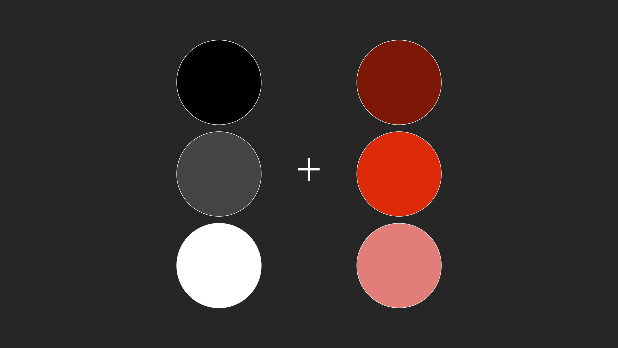 先用黑灰白做為視覺的基本色,再以企業的標準顏色為基礎,搭配較深與較淺的企業識別色 (這裡以紅色為例) ,用這六種顏色作為簡報配色。