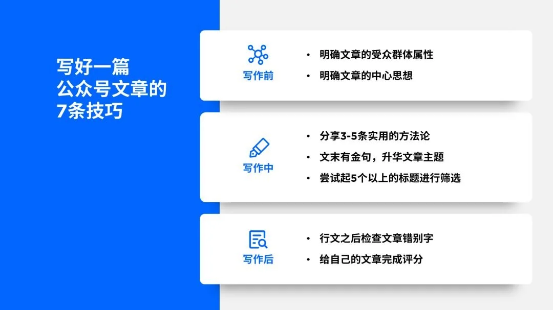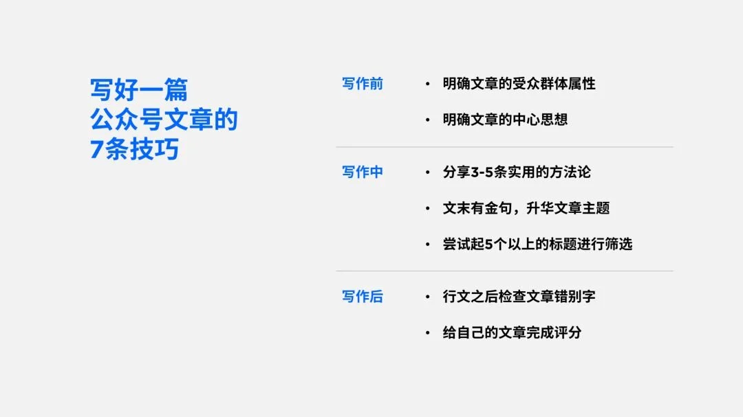 比如我們要去做一個知識的分享,關於如何寫好一篇公眾號文章,內容如下: