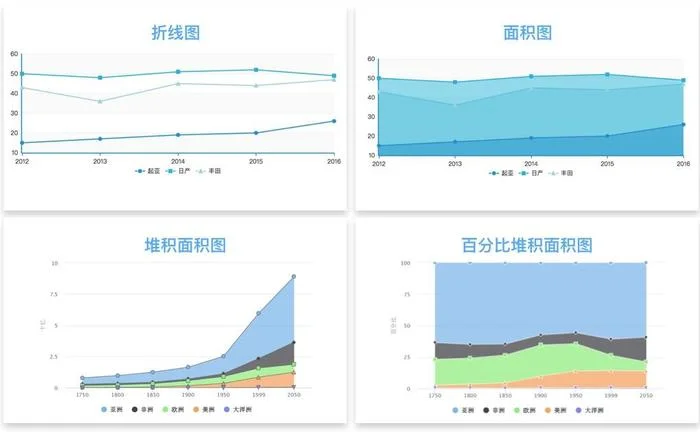 展示數據隨時間或有序類別的波動情況的趨勢變化。適用:有序的類別,比如時間。