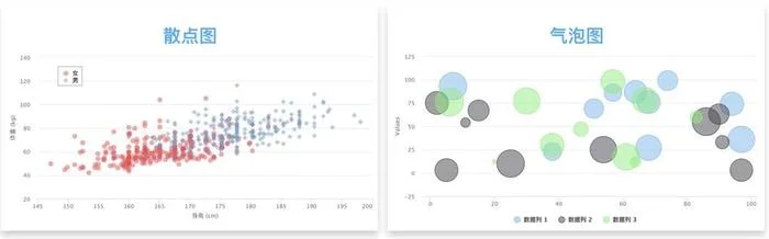 相似圖表:1)氣泡圖。用氣泡代替散點圖的數值點,面積大小代表數值大小。