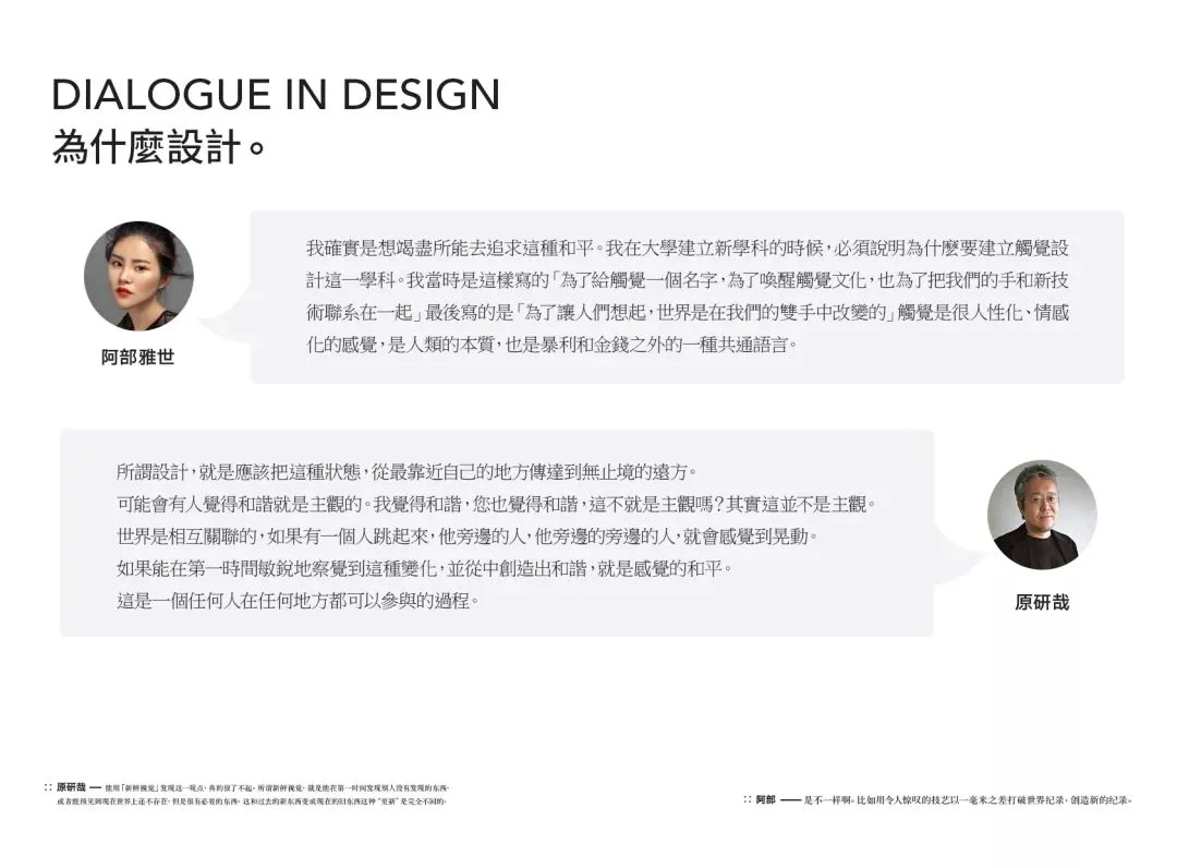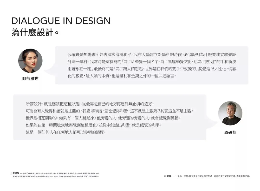 這裡我們以原研哉與阿部雅世的對話為例,當要使用的照片具有方向性時,要根據內容和照片主⻆的角度來擺放,兩位設計師面部的朝向都是向外,這樣就不符合對話的這種形式了。