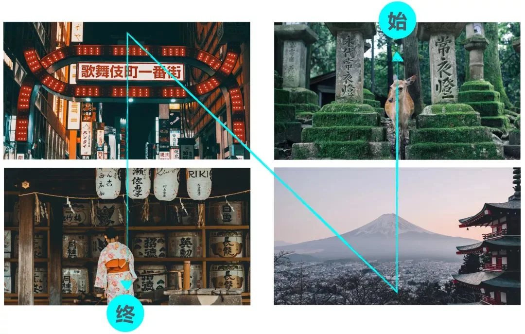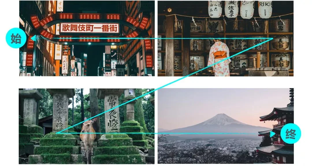 當我想突出日本人文情懷時,就把與之相關的照片放大,其他照片縮小,這樣圖片的對比就能更準確的傳遞信息(文字為模擬)。