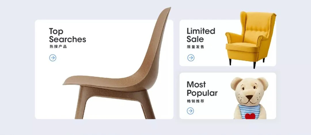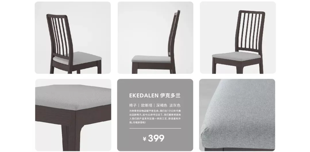 這一屏是座椅,因為圖片本身大小不一,所以我們劃分六個相同的色塊,統一大小,展示三個不同⻆度的照片,然後有兩個局部特寫,讓消費者有個直觀的感受,增加消費者對產品的信賴。