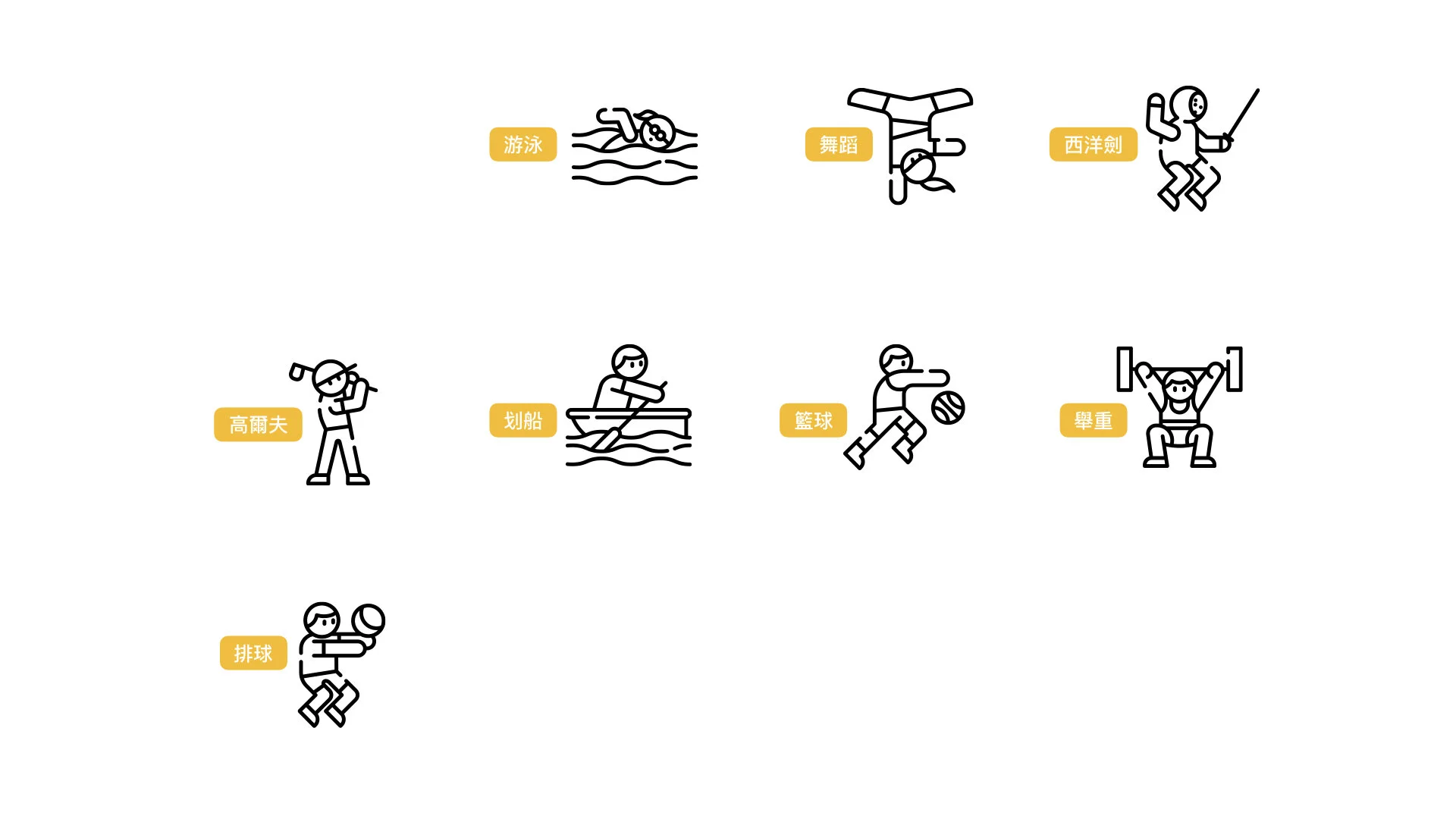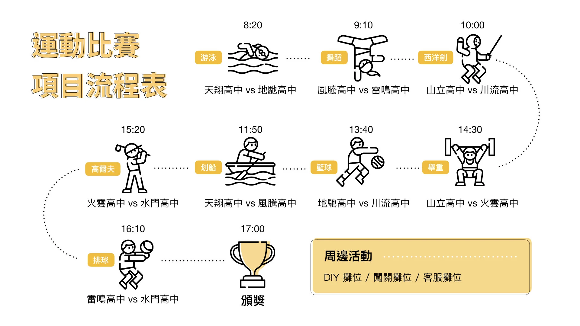 首先我們分析一下表格中的主要資訊是比賽項目的流程,因此我們可以將每個比賽項目都搭上一個可以傳遞相同意象的 icon 如下圖: