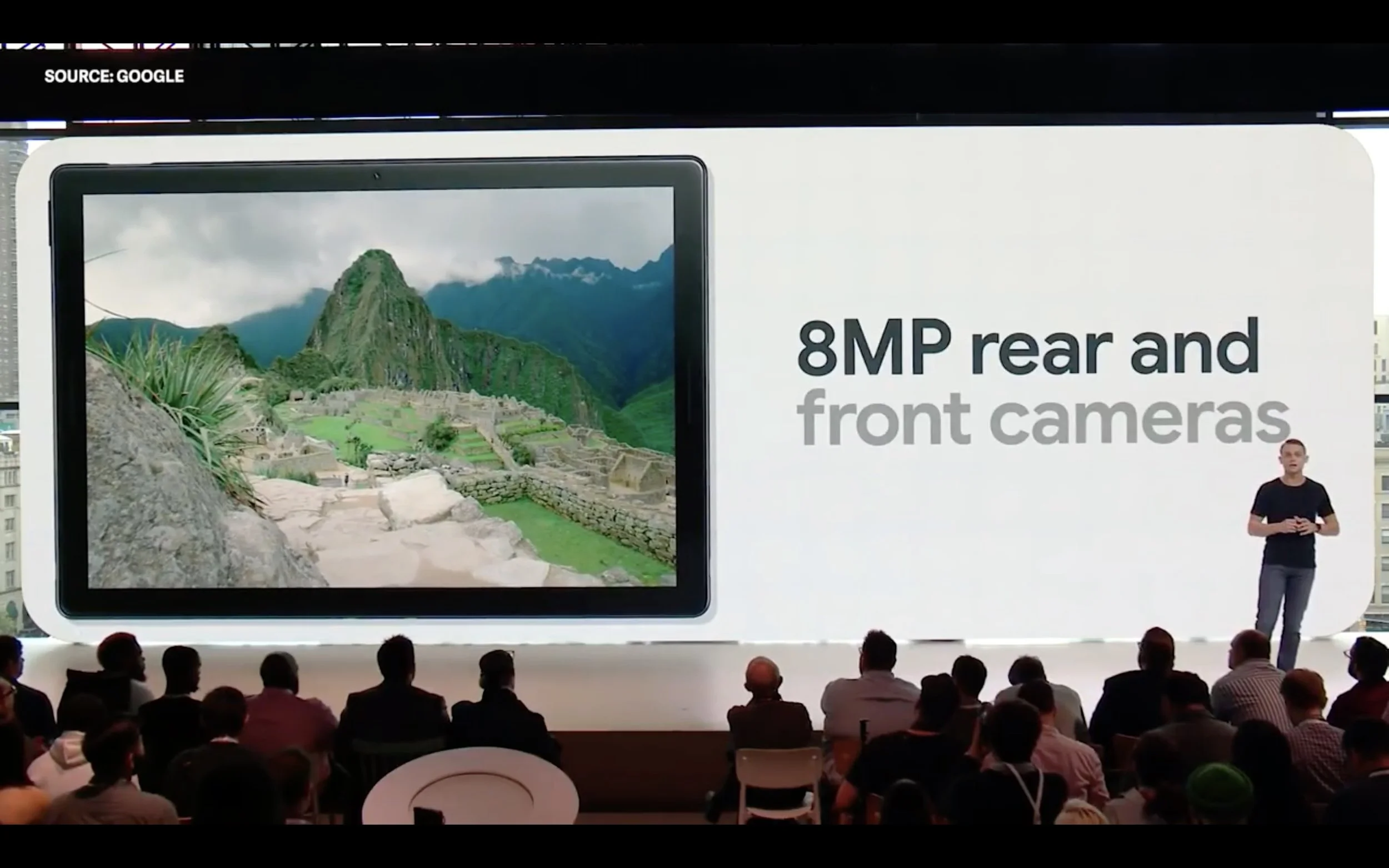 講稿:「不搭配完美音效,再美的畫面也是枉然。 Pixel Slate 將喇叭配置在裝置前端,讓您直接享受立體音效,而不是透過牆壁或地面折射。讓音量更大,更令人驚艷。」