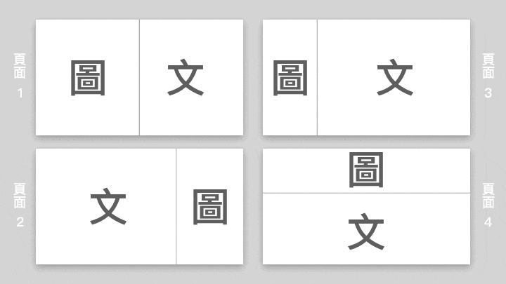 這時候我們仔細觀察會發現當我們把簡報內容經過一番整理後,幾乎會確定每一頁的簡報文字量與圖片量,根據我自己的經驗通常內容包含文字與圖片的頁面在整份簡報裡佔比很高,所以我們只要決定好圖片與文字個別的主要分布,應該就可以解決多數的簡報排版情況,按照這個原則,最後我歸納出一個我自己覺得好記又很容易上手的「一刀切」排版原則,具體做法如下: