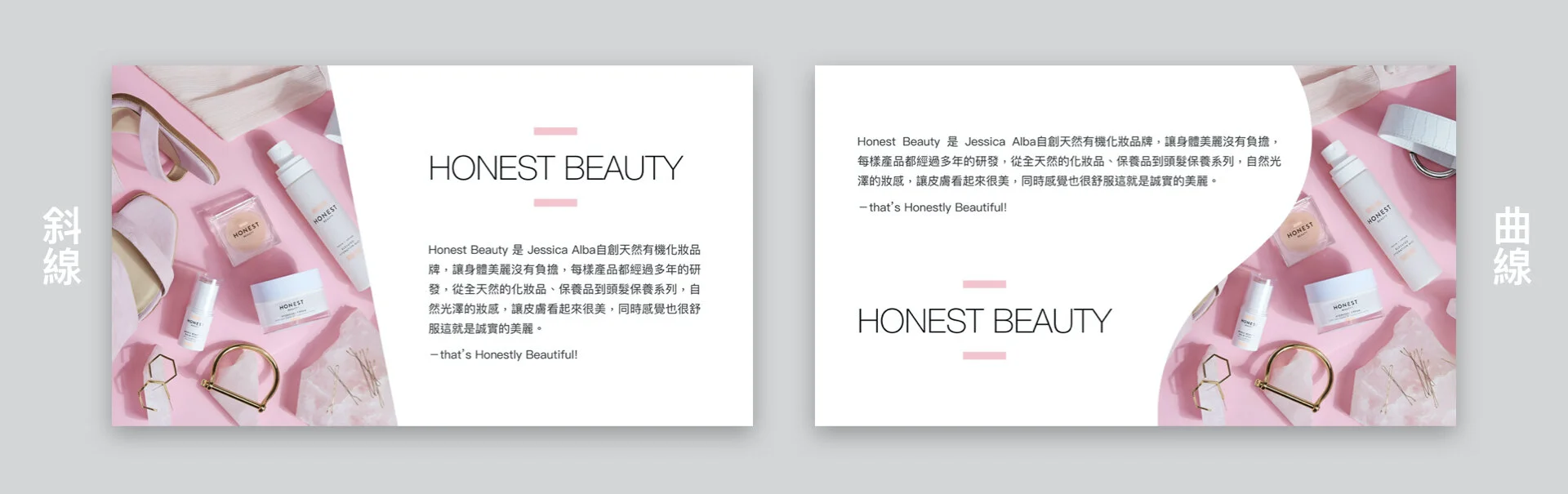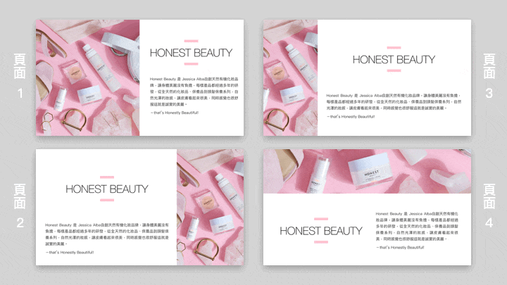 然後就按照這樣邏輯把素材擺進去。如果你要做的是一份保養品介紹簡報,就會變成這樣: