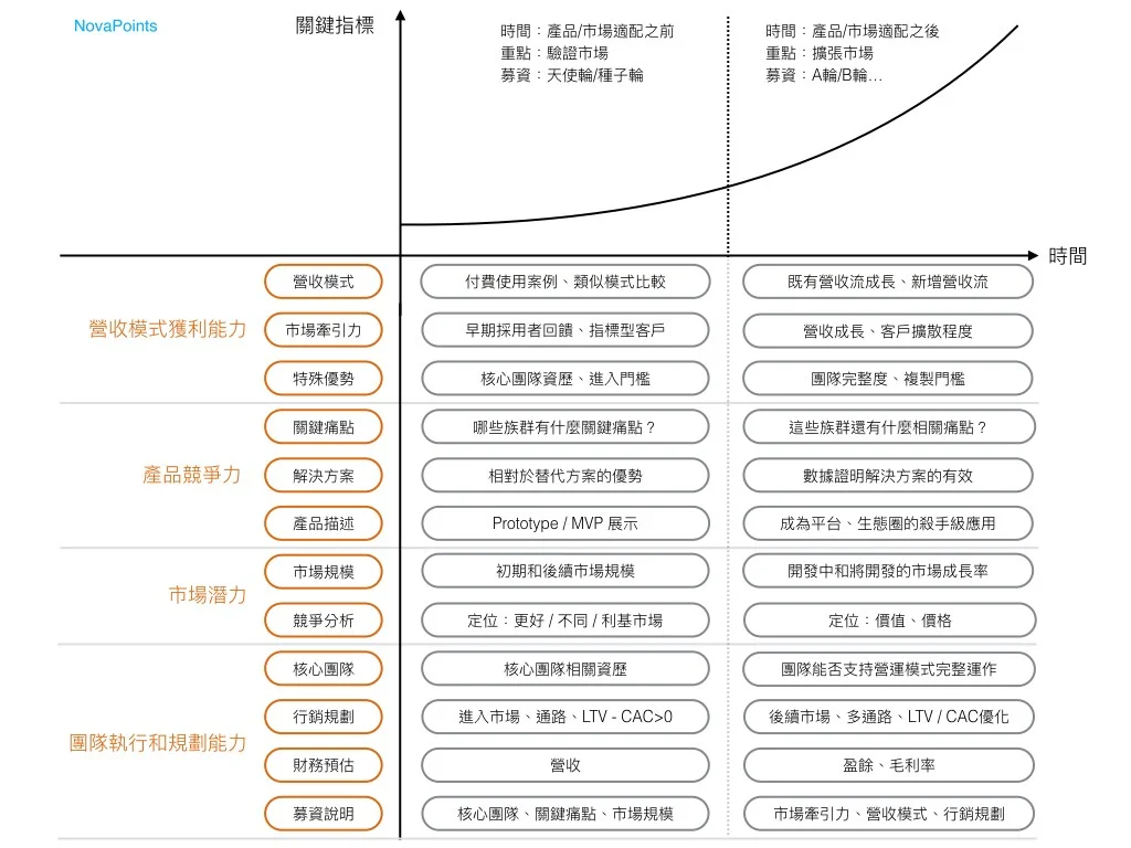 下圖是在不同階段在簡報各投影片的主要重點。階段只分兩個,就是產品/市場適配之前和之後(以下簡稱第一階段和第二階段),前者的主要目標是驗證市場,確認所做的產品在這個市場是可以發展的,後者的主要目標是擴張市場,當確認產品/市場適配存在之後,就是用最快速度佔據市場、獲得營收。在產品/市場適配之前的階段,募資主要是以天使輪和種子輪為主,在之後階段則以 A 輪、B 輪等之後的規模為主。在實際情況種子輪(或pre-A輪)和 A 輪有時後不那麼好明確定位,例如一家活躍使用者已經獲得上千萬並且已經募得種子輪的新創公司,還沒找到營收模式,那接下來的募資是該屬於 pre-A 還是 A 輪階段,這會見仁見智。我曾聽過一家大型跨國投資公司的合夥人說A輪是最難結案的募資輪,因為這階段常常很模糊,即便有了許多付費使用者,產品是不是真有潛力、有多少成長空間都未必清晰。