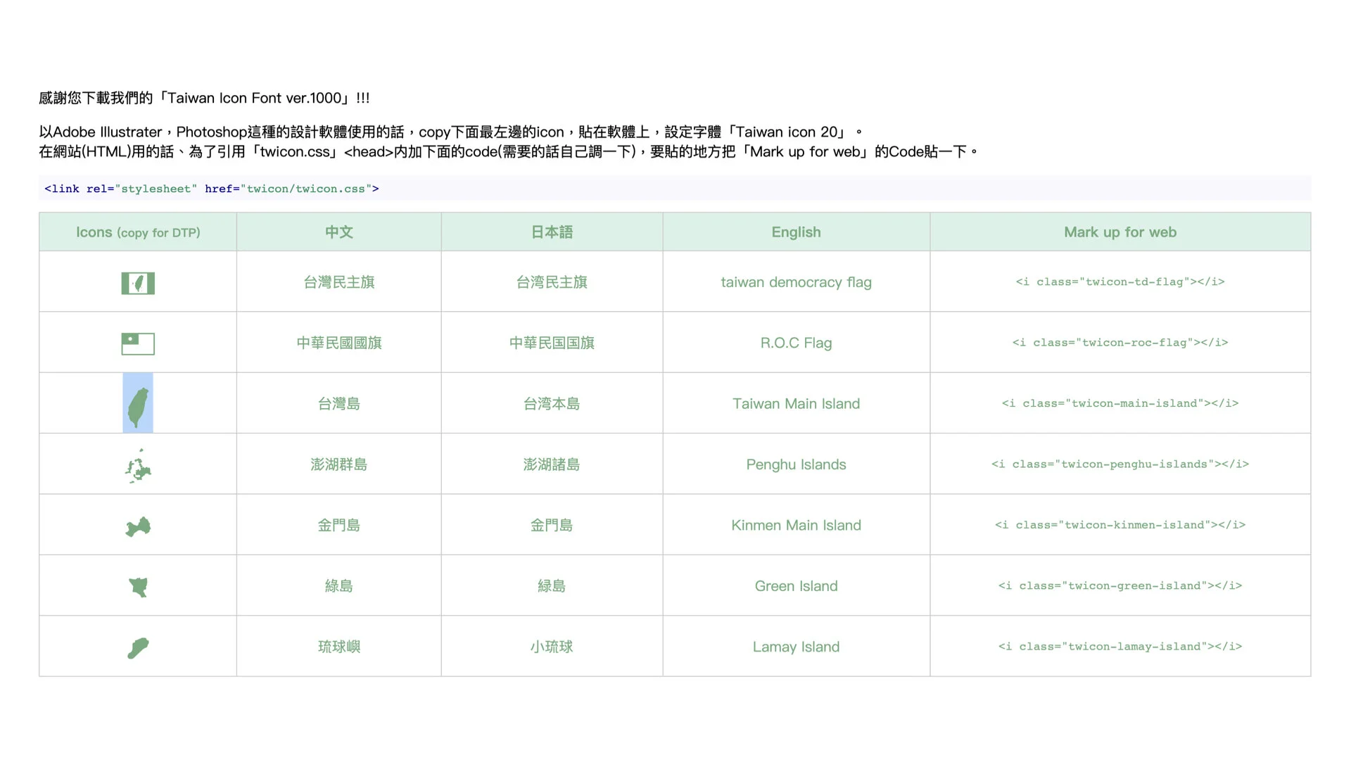 為了方便網頁設計師使用,Holoko 和 Rob 提供了網頁版專用的 woff、woff2 和 svg 格式,用戶只要打上對應的代碼,就能產生精美的台灣圖標,顏色和大小都能依照自己的需求來調整,減少了網頁圖片資源的使用。