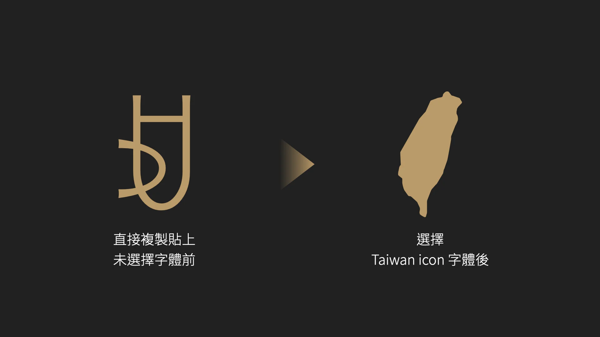 打開任意文件軟體 (Keynote、PowerPoint、Word 等),一開始貼上時會呈現亂碼,這時請選擇「Taiwan icon」字體,就能完美呈現台灣圖標。