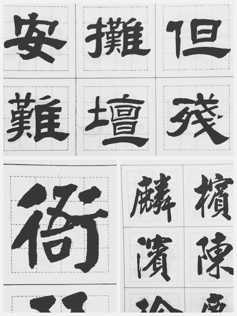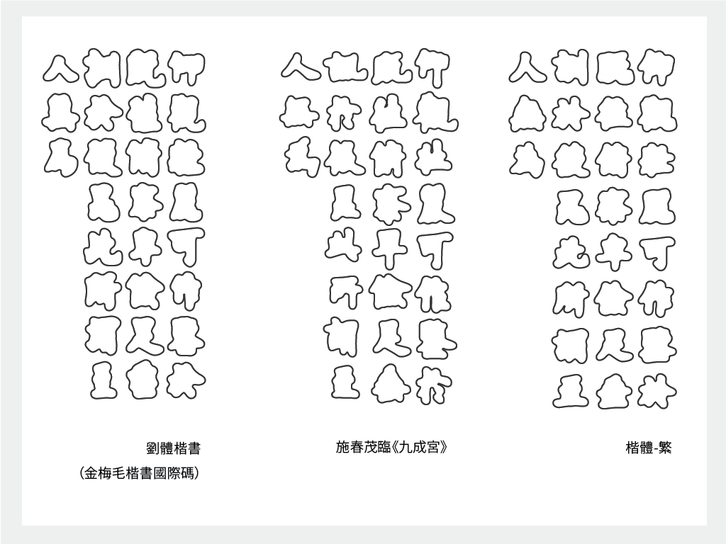 若把三種字體變成純粹的外框,會發現書法《九成宮》最形狀變化最靈活,有行氣。楷體-繁相較之下每個字的輪廓較為接近。而劉體楷書則介於中間。