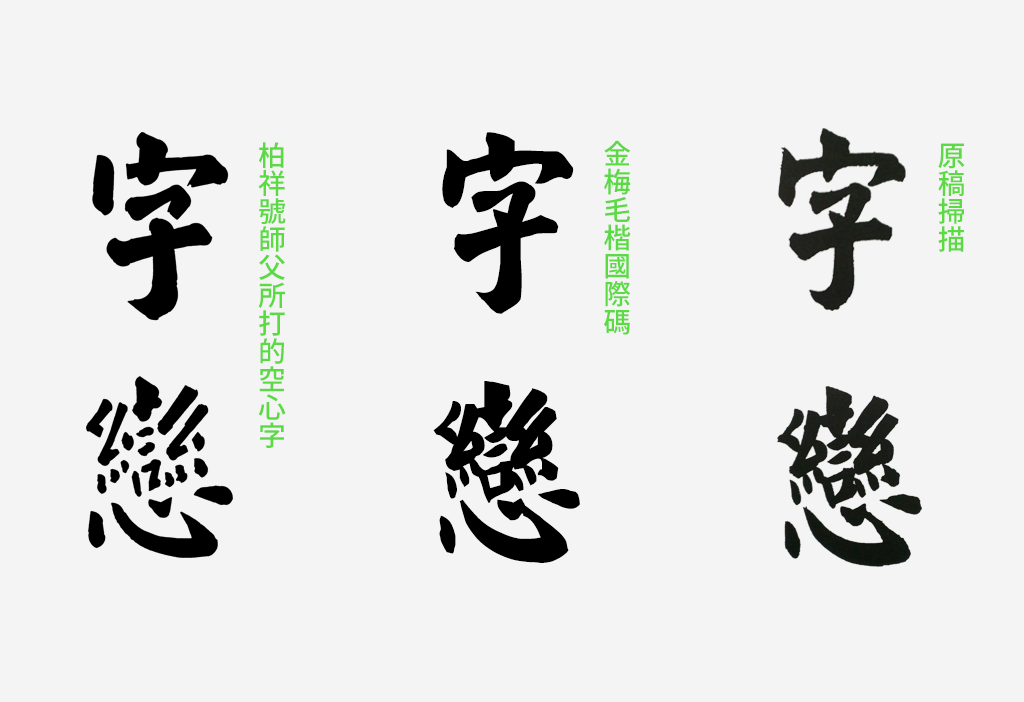 不久以前,我們以為大致不脫文鼎、金梅或中國龍三家公司都曾出品的「毛楷」類字型。前年台北市長選舉時,神通廣大的鄉民還找到了「經典繁毛楷」做成文創商品。這些字型在骨架與筆形上太過神似,可能是互相「參考」來「參考」去的緣故,原著應已不可考。