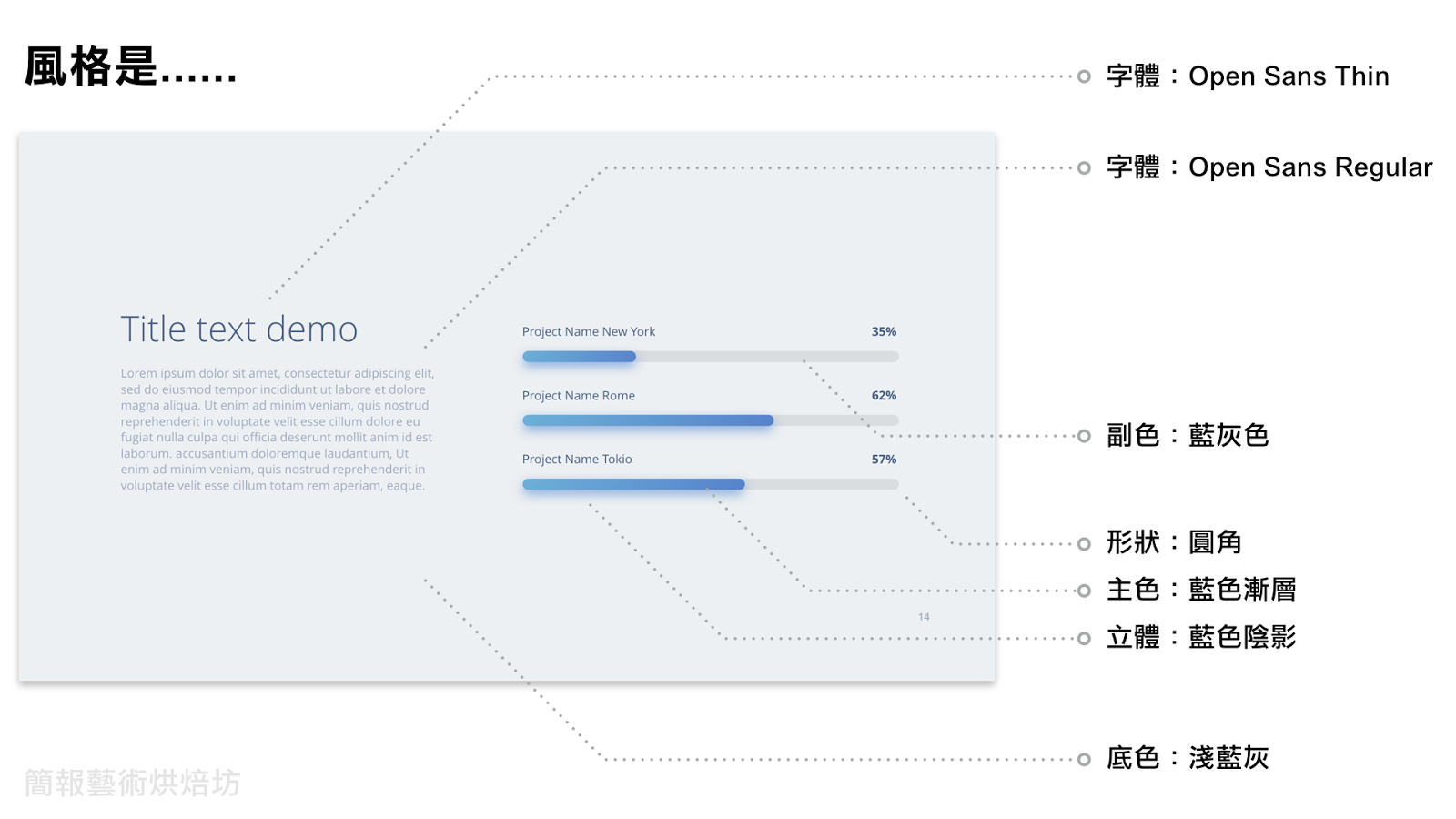 而風格就比較抽象了。風格可以說是素材的特徵,通常是形容詞,例如不同的顏色與字體、扁平或立體、銳利或圓滑等等。在剛剛的例子中,我們可以把這張投影片的風格一一拆解出來如下。