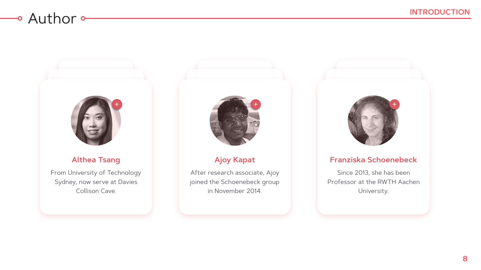 今天,如果我需要再做以上三位作者介紹的投影片,我可以怎麼利用這個素材?其實也很簡單,把這一頁中間的素材們全選起來貼上我的新投影片,將文字、照片等填入相對應的位置。最重要的是,要把這些素材的風格改成我新投影片的風格,因此我將顏色修改為紅色系、換掉了字體,也更改了母片的設置。如此,就能在很短的時間內製作出以下的投影片。