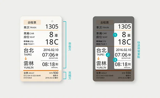 最後是視覺動線與文字的安排,我們將票面由橫式改採直式,與閘門的插卡方向一致,乘客在讀取車票訊息後,順手便可直覺式的插入驗票,提高流動效率。票面上的資訊,依照乘客實際的使用需求,由上而下作出重要性的順序分層,首先是「車次」、「車廂座位」、「列車時間」,最後才是「票種價格」與「票務編碼」。其中將最需要立刻看清楚,也可能會再三確認的「車次」、「車廂座位」與「站名」加大字級,並將數字統一放置右邊,可以讓乘客在最短的時間,立即理解搭乘資訊。而屬於高鐵方作業需要的「票種價格」與「票務編碼」,則在最底層,並以淺橘色塊做為視覺區隔。為因應外籍人士以及中高齡乘客增加的趨勢,我們選擇以UD通用設計的黑體為主,輔以英文,並在重要資訊上全面加大,盡力保持閱讀的舒適與效率。