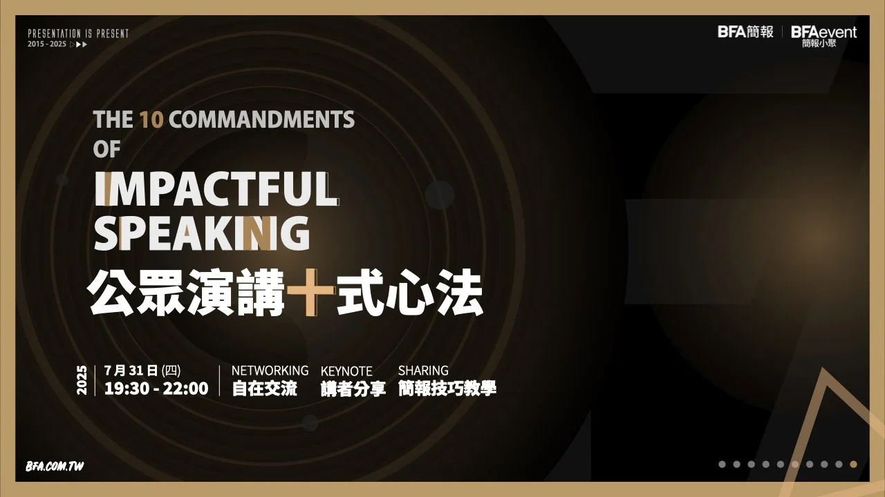BFA 簡報是台灣首個簡報溝通主題社群,致力於為職場人士提供最好的溝通學習與分享平台,喚醒每個人的職場影響力,提升華人整體簡報水平。在 BFA 簡報線上平台,整合華人世界最負盛名的簡報專欄,更與眾多國外媒體合作,將他們最好的作品翻譯成中文以饗讀者。線上平台之外,BFA 簡報也會定期舉辦線下聚會,透過實體活動讓簡報同好相互交流。BFA 簡報期許未來成為華人世界最好的簡報溝通社群。