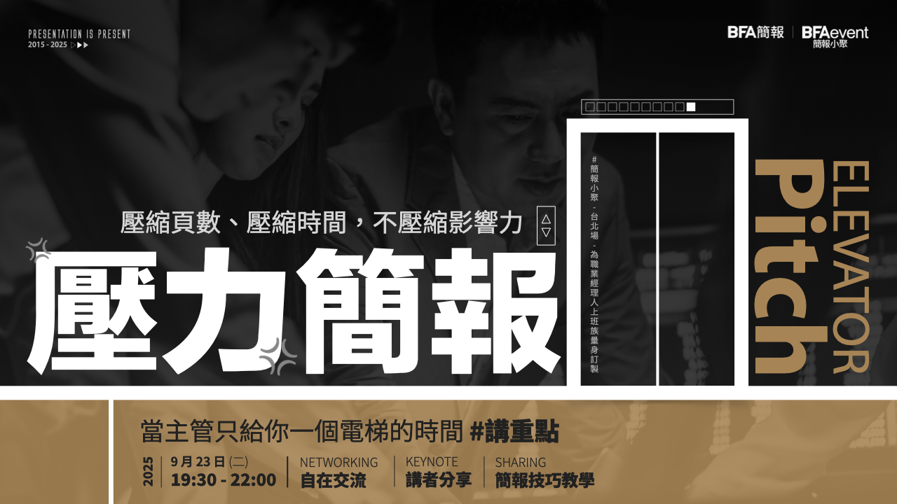 這場簡報小聚「壓力簡報.壓縮頁數、壓縮時間,不壓縮影響力」,要和大家分享如何在氣氛緊繃的情況下,快速交代結論,提煉核心關鍵,並且在台上從容應對,帶你鍛鍊在風雨中依舊清晰說重點的能力。