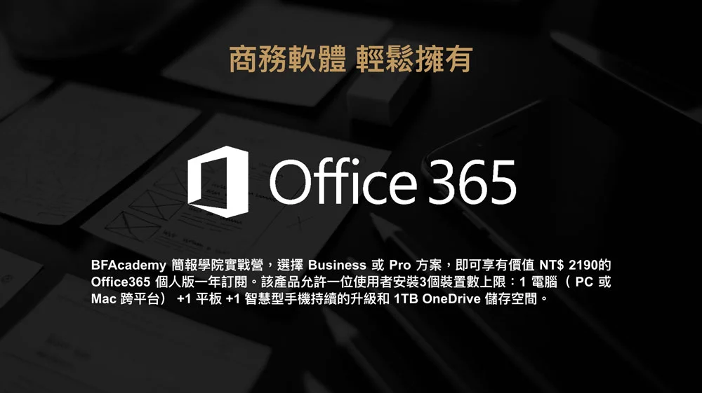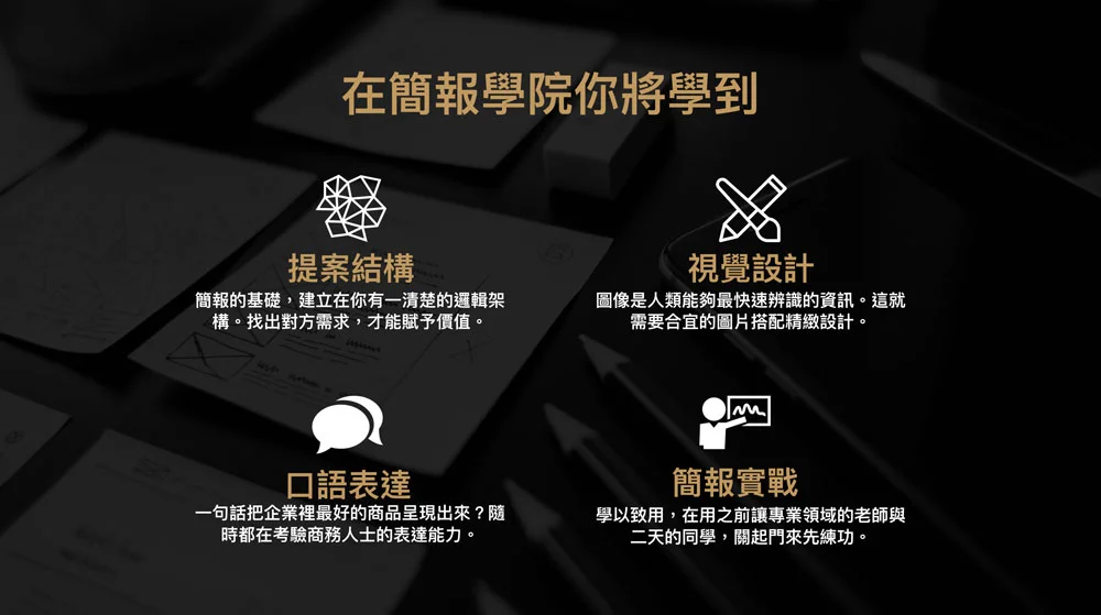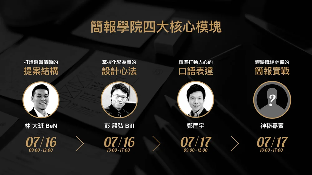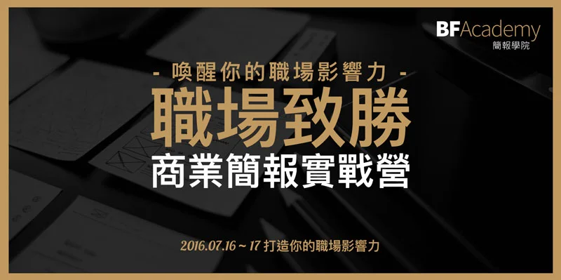 BFAcademy 簡報學院將帶領您從簡報的邏輯結構、視覺設計和口語表達三大領域中,針對「商業簡報」做一次系統且深入的學習。將由三位簡報老師各別專注在單一主題上,讓您輕鬆應對各種簡報挑戰,從此成為辦公室裡的簡報高手,笑傲職場。雙人同報即享 8折 團體優惠