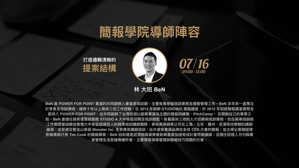 BeN 是 POWER FOR POINT 寶渥的共同創辦人兼首席培訓師,主要負責簡報培訓業務及運營管理工作。BeN 多年來一直專注於零售及培訓領域,擁有十年以上兩岸三地工作經驗。在 2013 年創辦 STUDIOBiG 簡報講堂,於 2015 年初將簡報講堂業務全部併入 POWER FOR POINT,並共同創辦了台灣首個以創業募資為主題的簡報訓練營:PitchCamp。 在開創自己的事業之前,BeN 曾擔任蘋果優質經銷商 STUDIO A 大中華區招聘及培訓總監,負責兩岸三地的人才招募與培訓業務。他在蘋果經銷商工作期間曾訓練並管理大中華區超過百人的蘋果培訓講師團隊,參與美商蘋果公司在上海、北京、廣州、武漢等地舉辦的講師論壇,並受邀至舊金山參與 Monster Inc. 全美菁英講師培訓,此外還負責過品牌在全球 CES 大會的簡報,並主導企業總經理對蘋果執行長 Tim Cook 的簡報專案。BeN 目前還是經濟部與資策會新興產業加速育成計畫特邀講師,並擔任經理人月刊與專案管理生活思維專欄作者,主要撰寫領導管理與簡報技巧相關的文章。