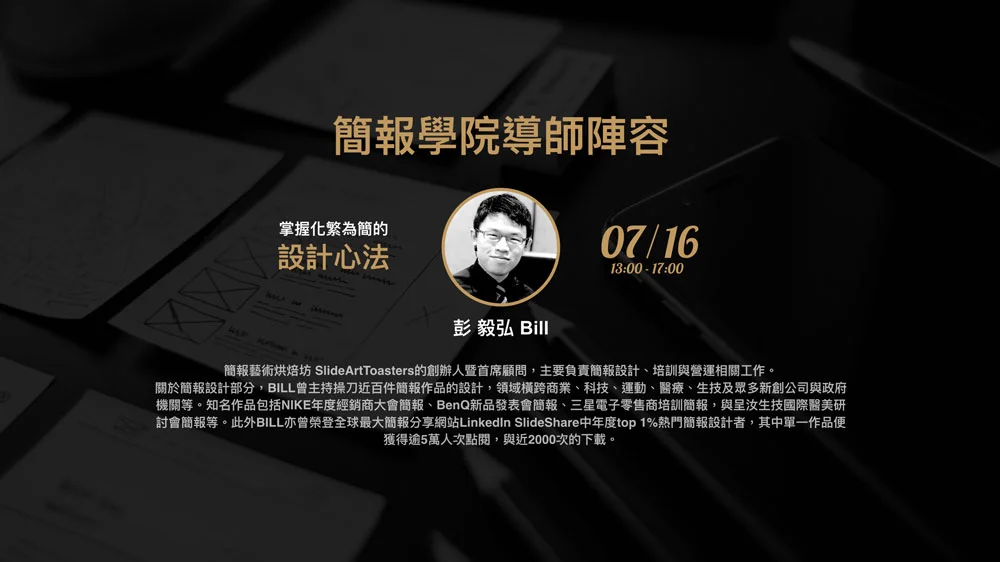 簡報藝術烘焙坊 SlideArtToasters的創辦人暨首席顧問,主要負責簡報設計、培訓與營運相關工作。關於簡報設計部分,BILL 曾主持操刀近百件簡報作品的設計,領域橫跨商業、科技、運動、醫療、生技及眾多新創公司與政府機關等。知名作品包括 NIKE 年度經銷商大會簡報、BenQ 新品發表會簡報、三星電子零售商培訓簡報,與呈汝生技國際醫美研討會簡報等。此外 BILL 亦曾榮登全球最大簡報分享網站 LinkedIn SlideShare 中年度 top 1% 熱門簡報設計者,其中單一作品便獲得逾 5 萬人次點閱,與近 2000 次的下載。